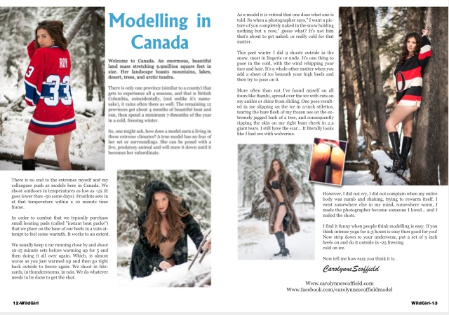 Flashback to two months ago, in my best friend and stylists kitchen. I received an email from the editor saying she loved my writing samples AND my modelling and would love to have me contribute something to the magazine. I was assigned a 600 word article with min 2 pics within 3weeks. It had to be about something extreme. So, I figured, why not let the good ol UK in on what it’s like to model, in winter, in canada.