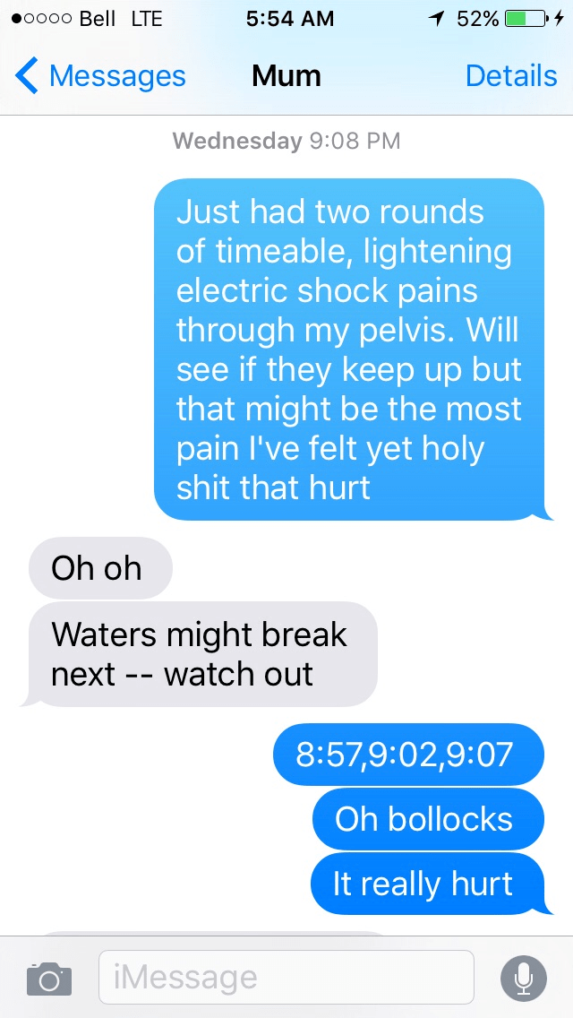 I began having, what I can describe as “lightning stabbing” pains in my crotch (which I would later learn was lightening of the cervix) I texted my mum and she said,