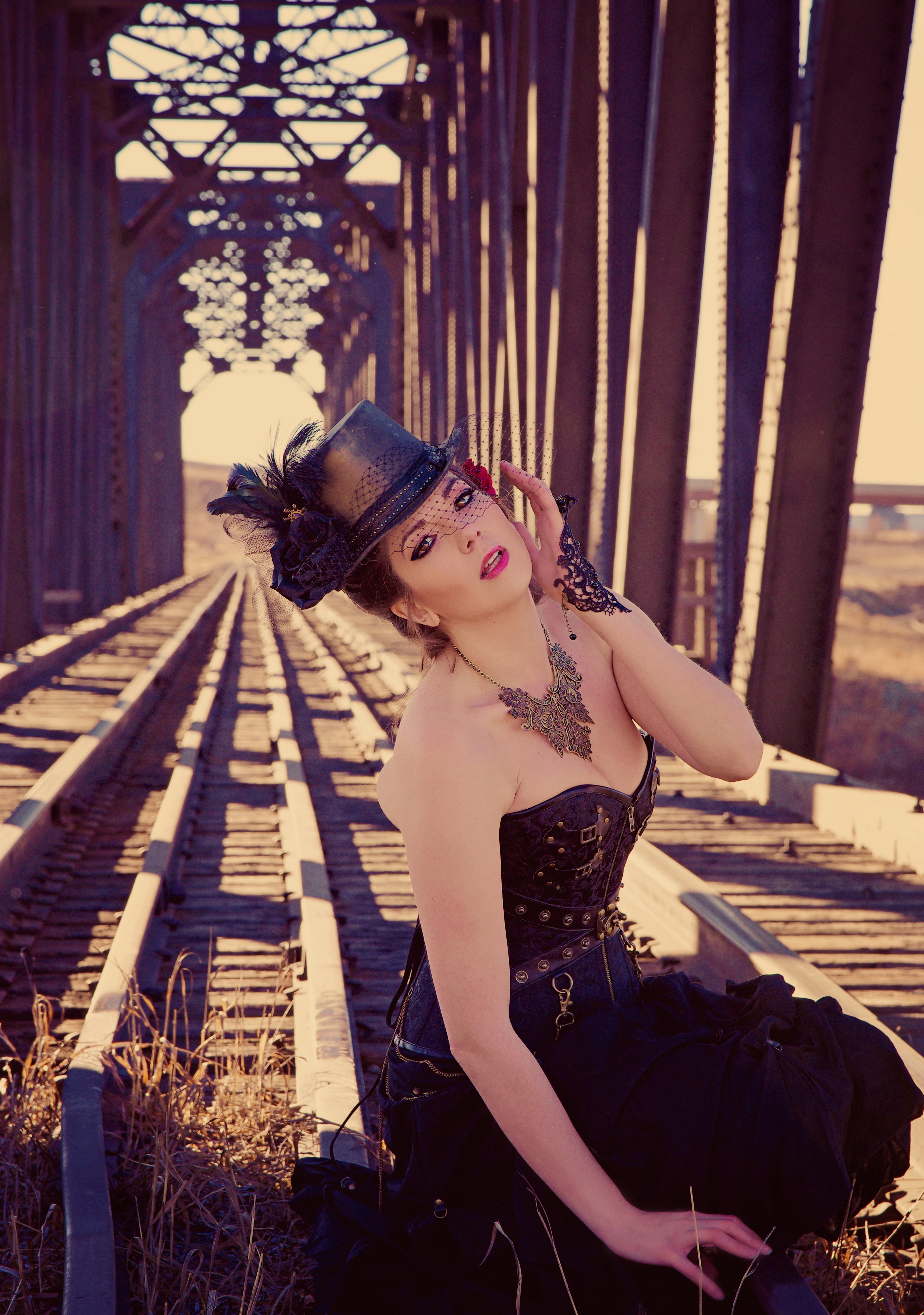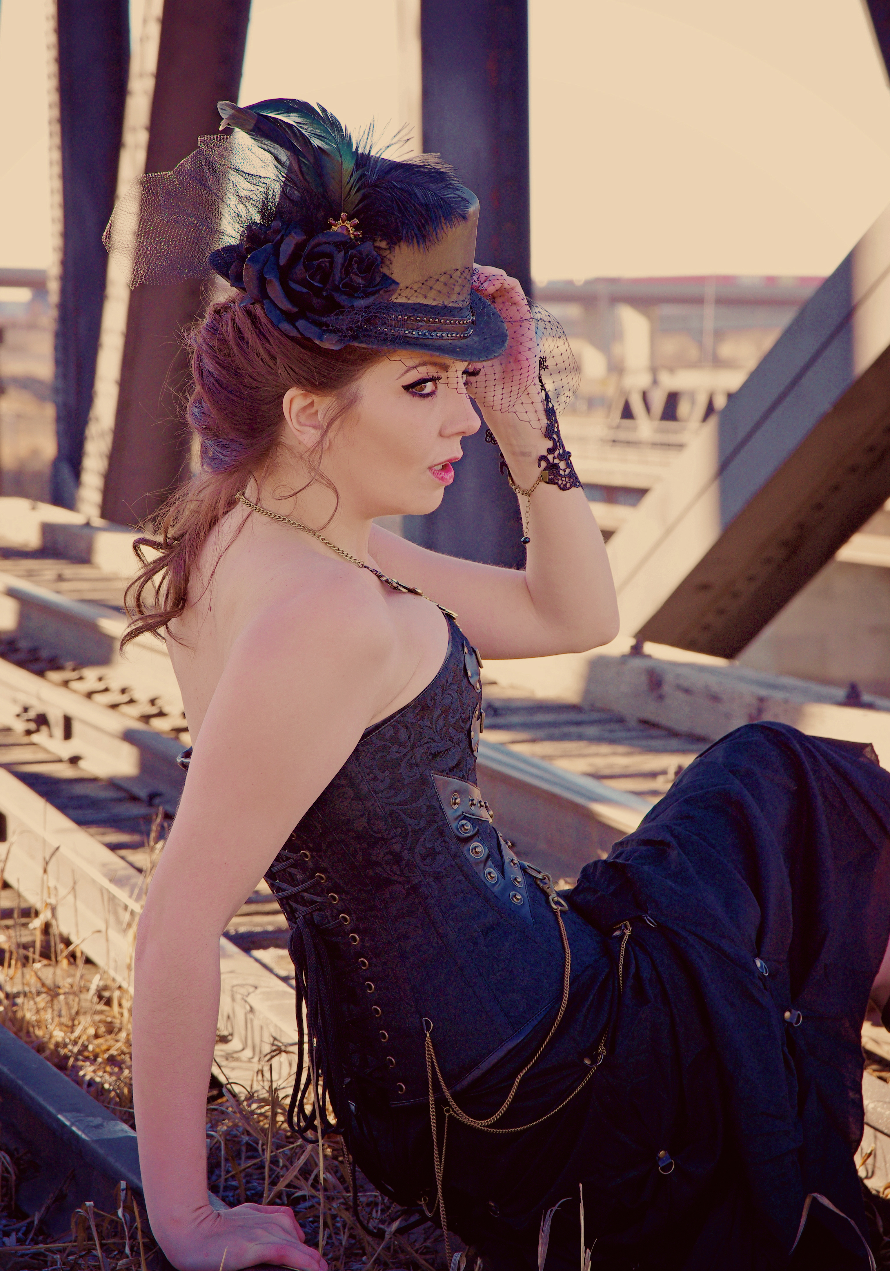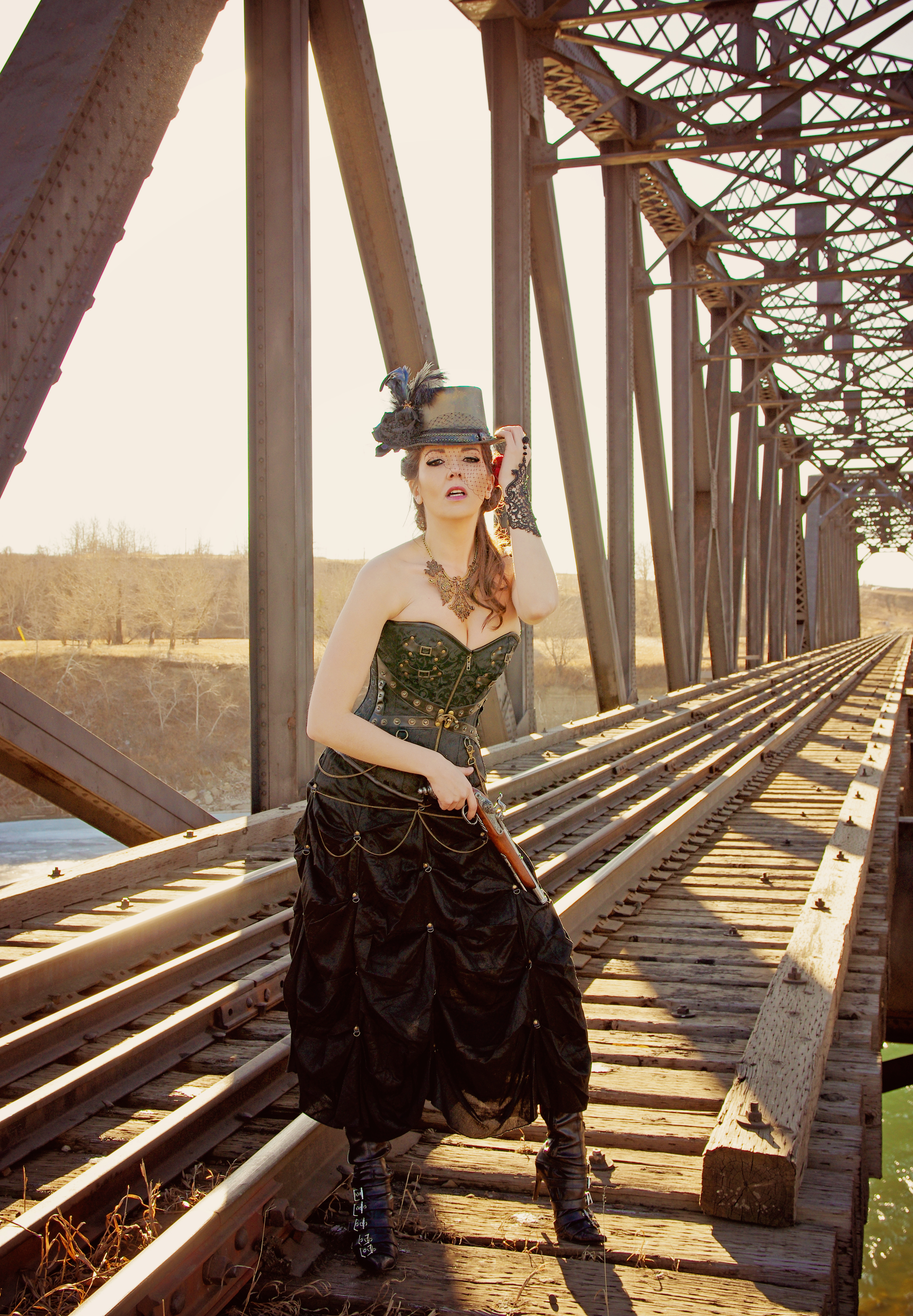 Jenny brainstormed a steampunk shoot, so we arranged to meet early one cold, spring morning to shoot on a railroad track and bridge. She brought my outfit and everything all I had to do was get my hair and makeup done (by Tara of course) and bring shoes 🙂