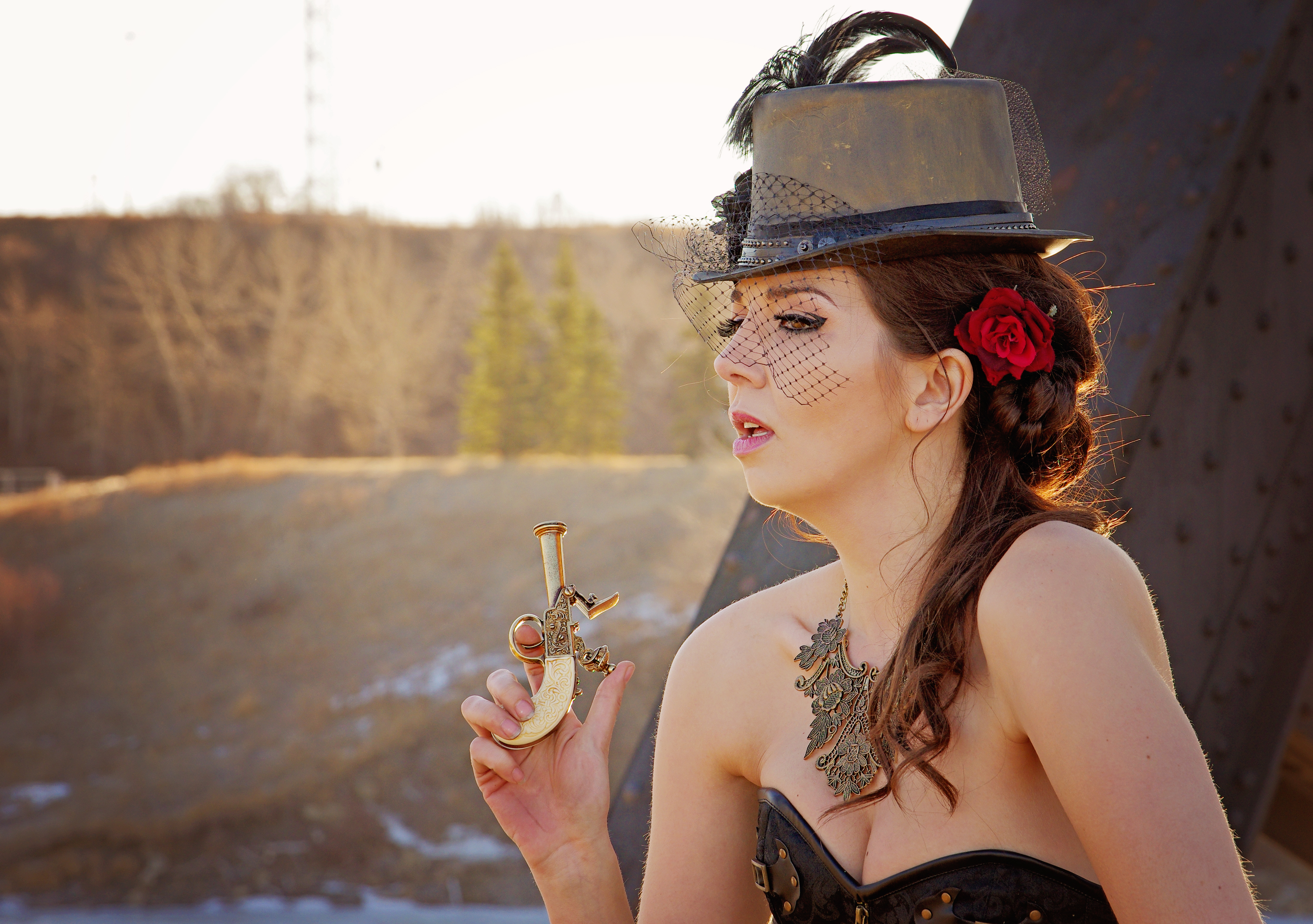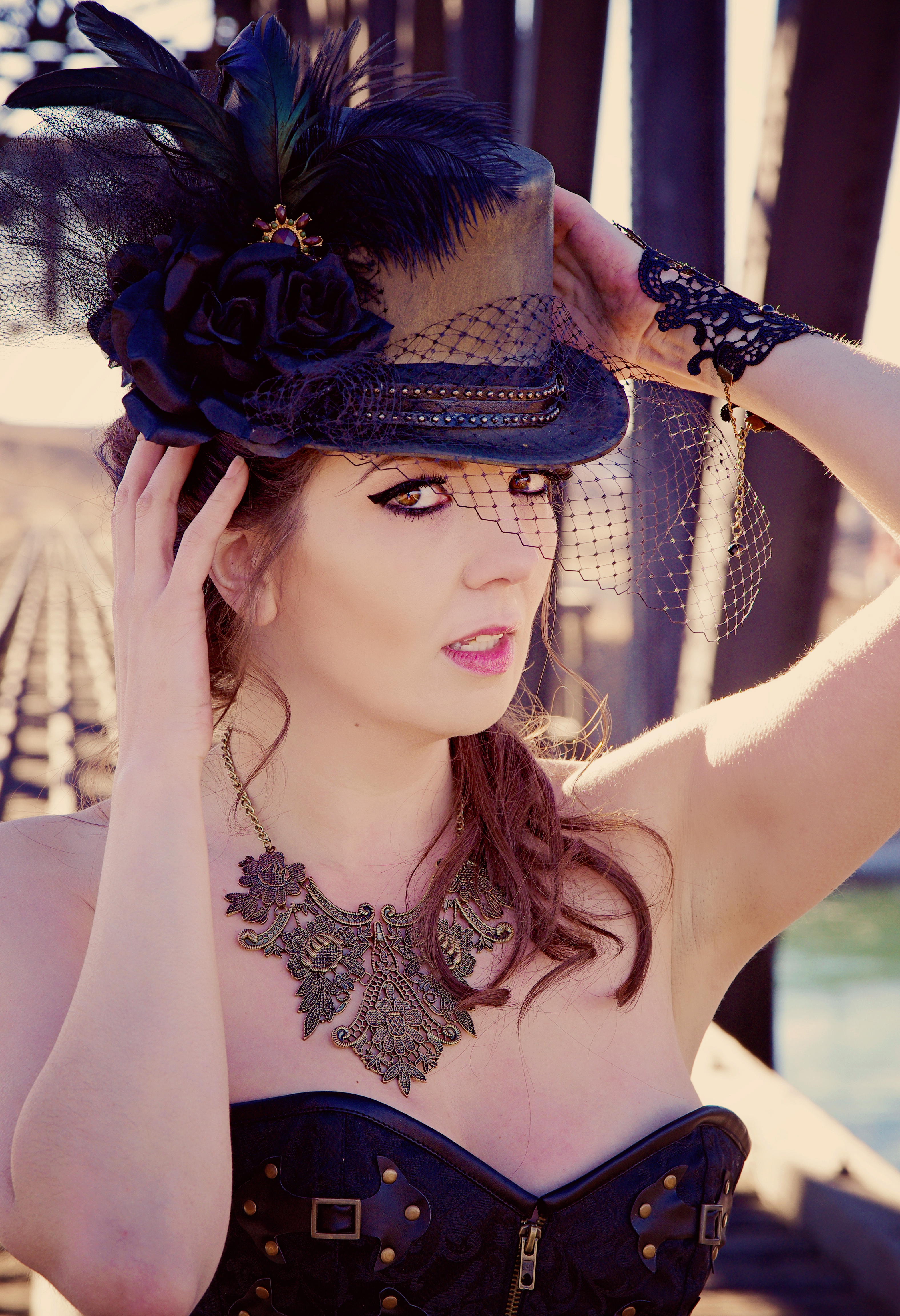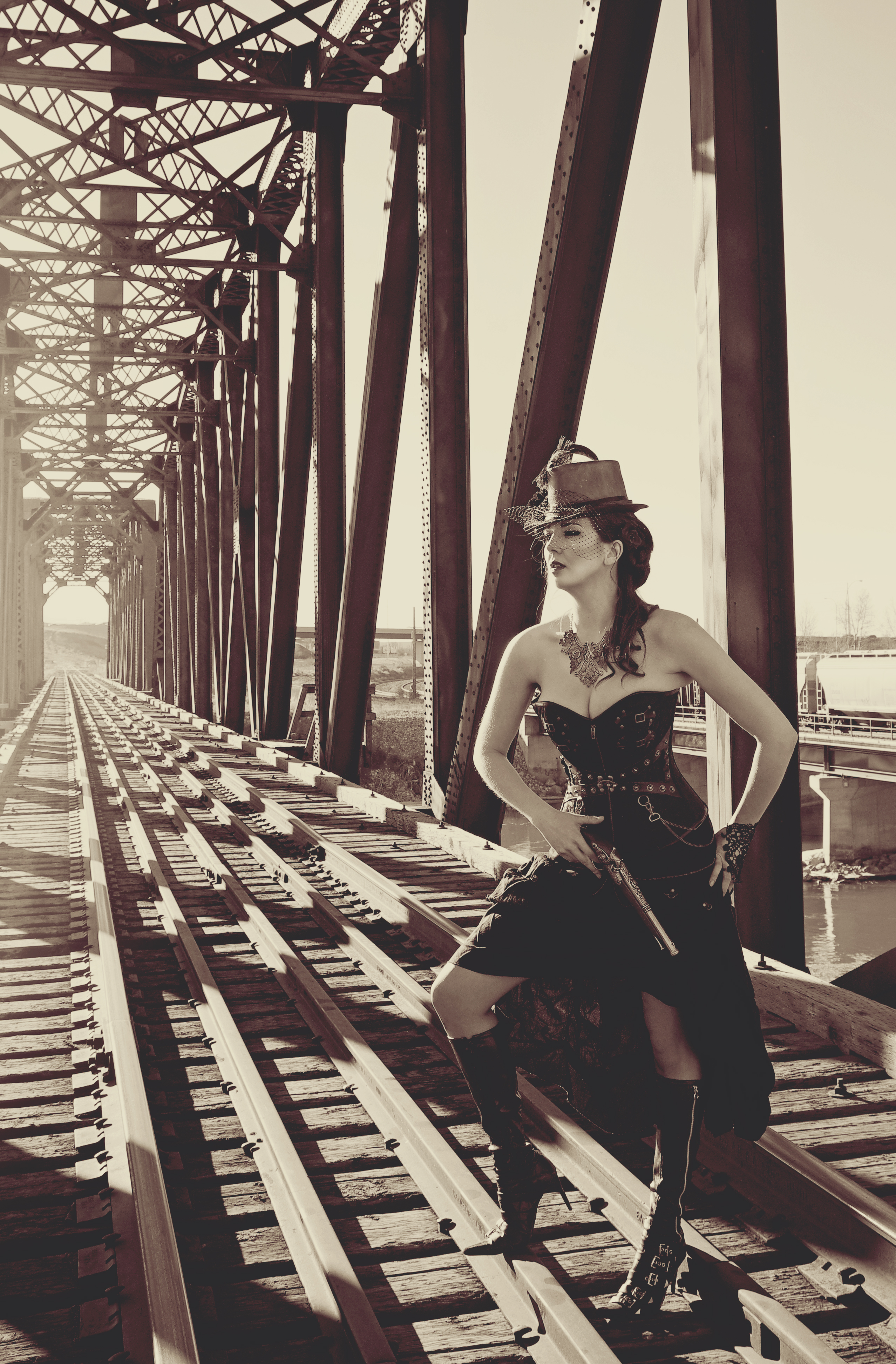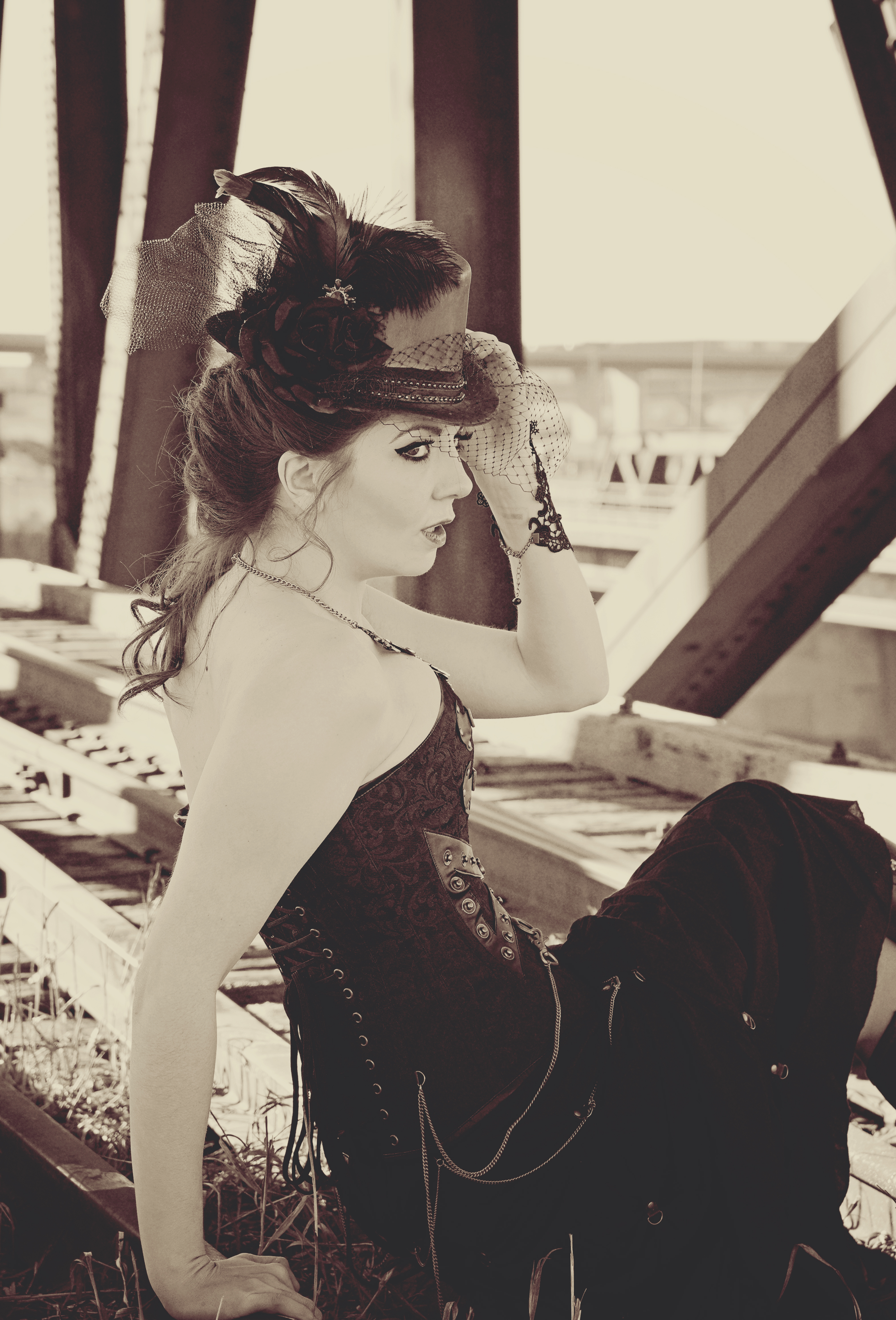 Jenny brainstormed a steampunk shoot, so we arranged to meet early one cold, spring morning to shoot on a railroad track and bridge. She brought my outfit and everything all I had to do was get my hair and makeup done (by Tara of course) and bring shoes 🙂